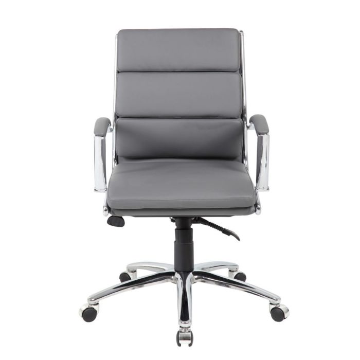 The mid-back executive CaressoftPlus chair in grey with the metal chrome finish is as comfortable as it is handsome. The chair utilizes a two paddle mechanism which designates one paddle for lift and one paddle to release spring tilt or lock; it is very heavy duty. The chair is made with a material called CaressoftPlus which is a trademarked vinyl that is an ultra-soft, breathable upholstery that looks & feels like leather, but more durable & easy to clean. The chair also offers tilt tension, a pneumatic gas lift and an upright lock. It has been designed with a sturdy 27 inch chrome base with 2 inch nylon dual castor wheels and has a weight capacity of 275 lbs.