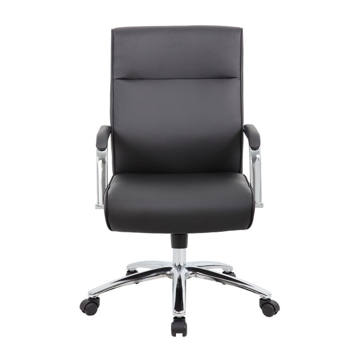 The Modern Executive Conference Chair in black is a fine looking chair made with high quality CaressoftPlus vinyl. CaressoftPlus is a trademarked, ultra-soft, breathable upholstery that looks & feels like leather, but more durable & easy to clean. The chair also features a spring tilt mechanism that allows one to change the angle of the entire seat relative to the floor and allows one to transfer some of the upper body weight to the backrest of the chair. In addition to this the chair also boasts a sturdy 27 inch chrome base with 2 inch nylon dual wheel castors and a 275 lbs. weight capacity.