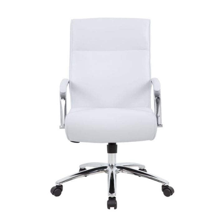 The Modern Executive Conference Chair in white is a fine looking chair made with high quality CaressoftPlus vinyl. CaressoftPlus is a trademarked, ultra-soft, breathable upholstery that looks & feels like leather, but more durable & easy to clean. The chair also features a spring tilt mechanism that allows one to change the angle of the entire seat relative to the floor and allows one to transfer some of the upper body weight to the backrest of the chair. In addition to this the chair also boasts a sturdy 27 inch chrome base with 2 inch nylon dual wheel castors and a 275 lbs. weight capacity.