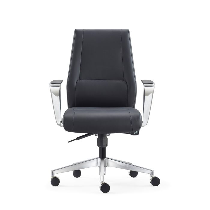 The Design Tech DT720 Mid-Back Executive Chair in black with a polished aluminium base offers a sophisticated blend of style and functionality. This conference & executive desk chair features clean lines and a synchro-tilt mechanism for enhanced ergonomic support. The chair boasts a generous 4" thick foam seat and back, ensuring optimal comfort during extended use. Upholstered in premium faux leather, the DT720 provides a luxurious seating experience. Unlike traditional conference chairs that may elevate your legs during movement, the DT720's synchro-tilt mechanism offers passive ergonomic support, maintaining proper posture throughout the workday.