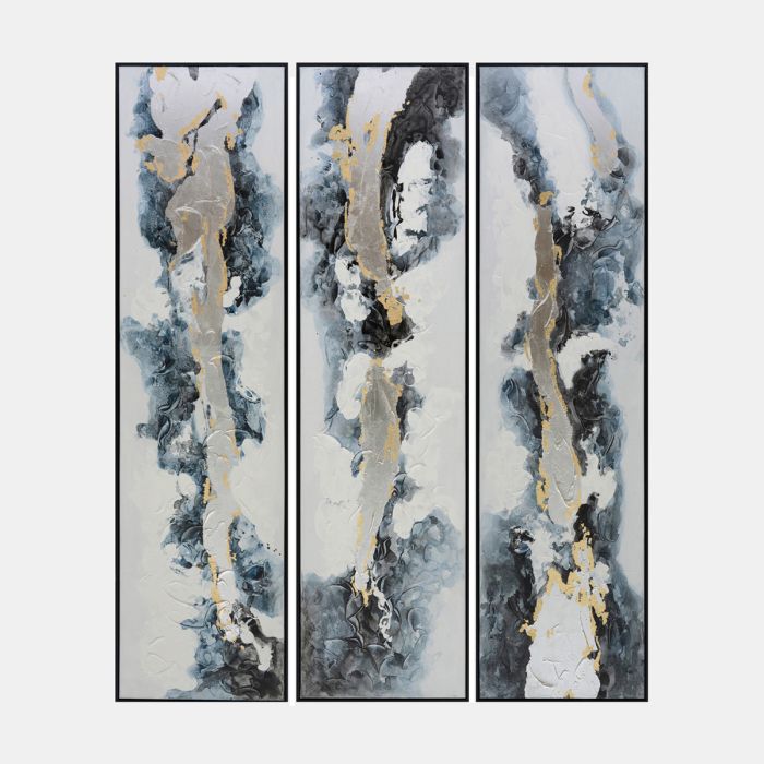 Each panel in this set measures 86"x23" x 2" depth, making a significant impact wherever they are displayed. The textured design of the paintings adds depth and dimension, inviting viewers to pause and appreciate the intricacy of each brushstroke. Crafted with a contemporary style in mind and weighing a total of 45 lbs, these paintings are not just decorative pieces but symbols of Sandlebridge's commitment to quality and design excellence.