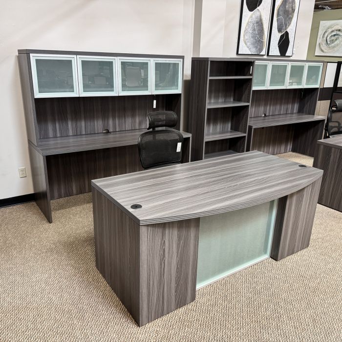 Used DSA Right Pedestal Bow Top Desk with Credenza & Hutch Set (Grey) DEE1896-007
