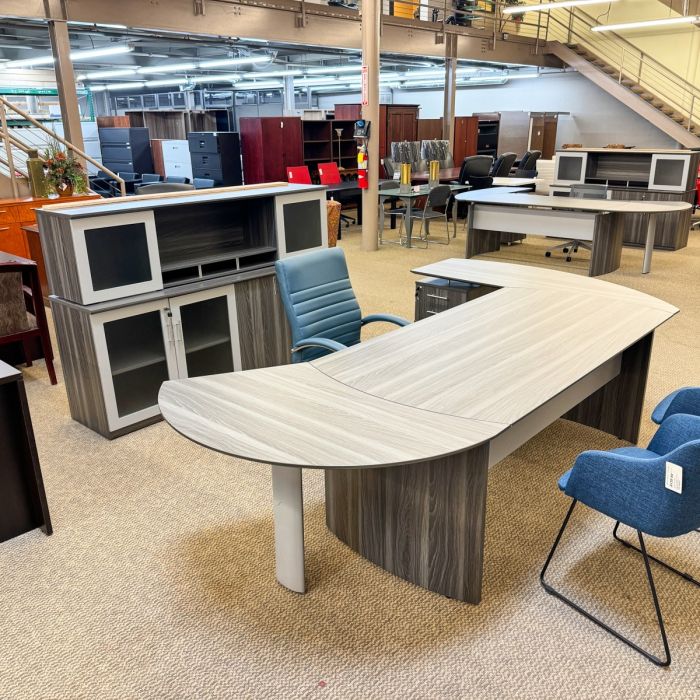 Used Mayline Left Curved L-Shape Desk with Credenza & Overhead Hutch (Grey) DEL1861-001