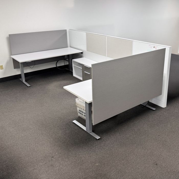 Used Teknion P-Pack Height Adjustable Desk with Powered Partition Wall (White & Grey) CUB1886-025